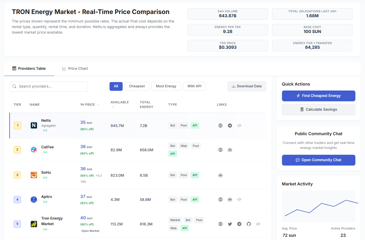 Netts works in the background to compare Energy providers, so users have access to the lowest price TRON Energy in real-time. Netts also provides a comprehensive TRON Energy comparison, and through a transparent marketplace, allows developers and daily traders to save big on operational costs, showing that while the crypto market may be volatile, the infrastructure it operates on can still be a well-oiled machine that is optimized toward efficiency and cost savings.