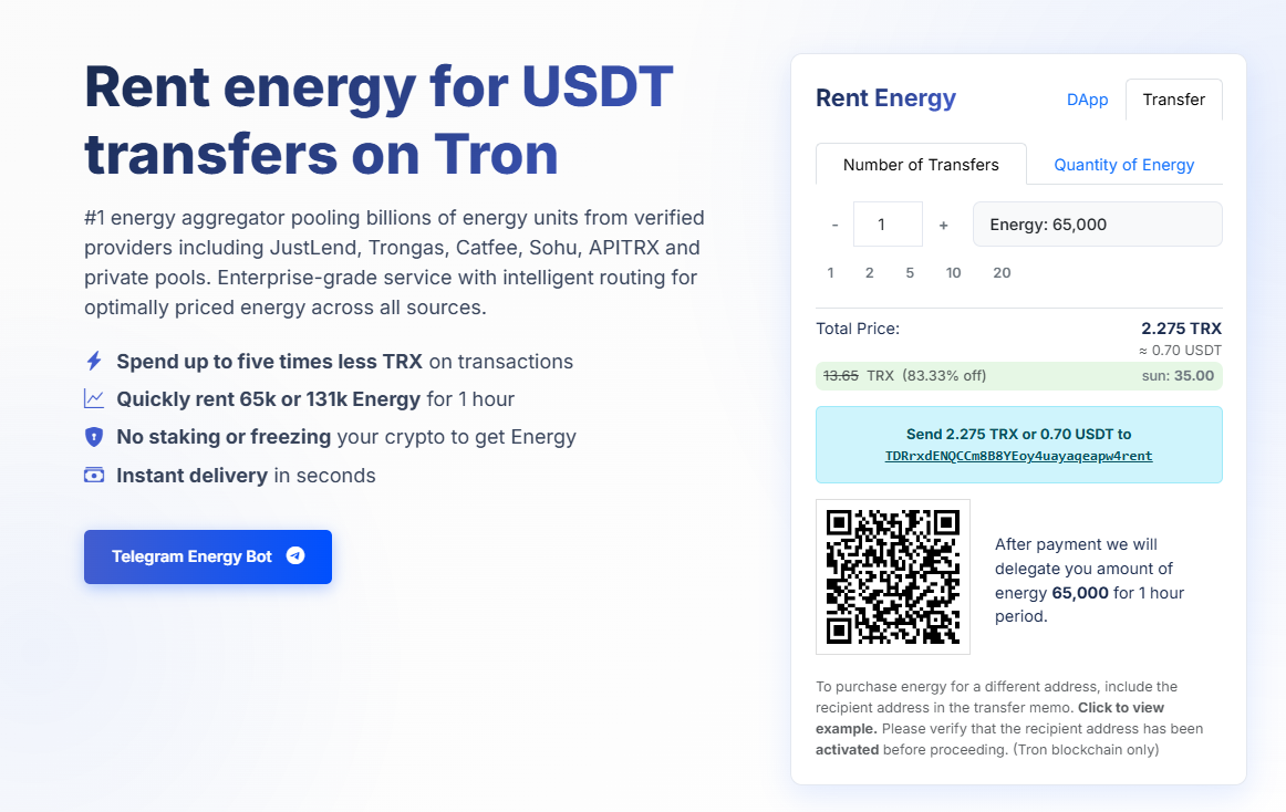 So now let us move towards the practical solutions that exist today for tackling these operational costs. Platforms that aggregate energy in order to rent it have turned USDT transfers on Tron into a walk in the park.