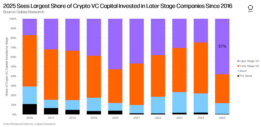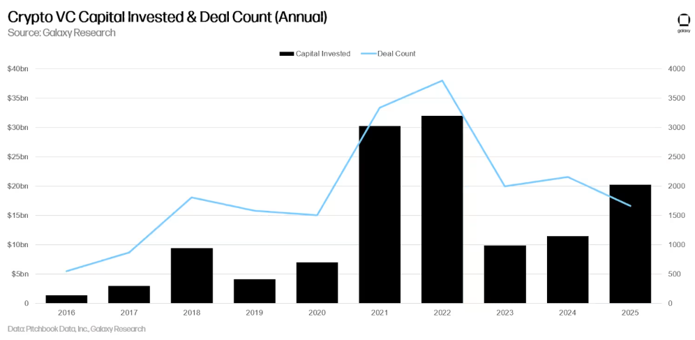The 2025 crypto venture landscape is meaningfully different from the peak in ’21, despite the amount of total capital deployed getting closer to similar figures. VC investment in crypto more than doubled between 2024 and 2025 — the first time since 2022 that quarterly flows consistently topped eight billion dollars — but the make up of that capital changed radically.