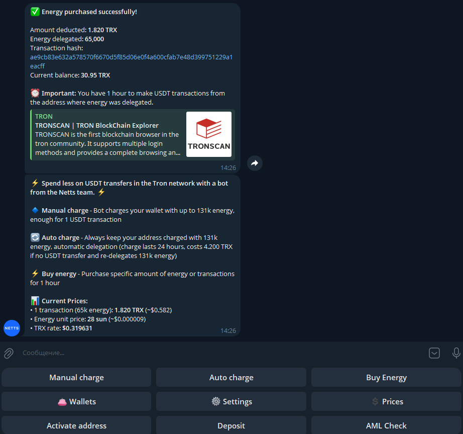 The more immediate challenge is simpler: bringing transaction costs down. That is exactly why the TRON Energy Telegram bots became a thing, and Netts Energy Charge Bot is among the most useful implementations so far. Users enter their wallet addresses, make a TRX deposit and there is an Energy supply (on demand) prior to each USDT transfer — with users only being charged for the actual consumption. For those with frequent transfer needs in Energy and without desire to stake TRX or 'waste' it via burn, Netts bot can be used for the task from Telegram; it supports standard TRON wallets like TronLink or Trust Wallet.