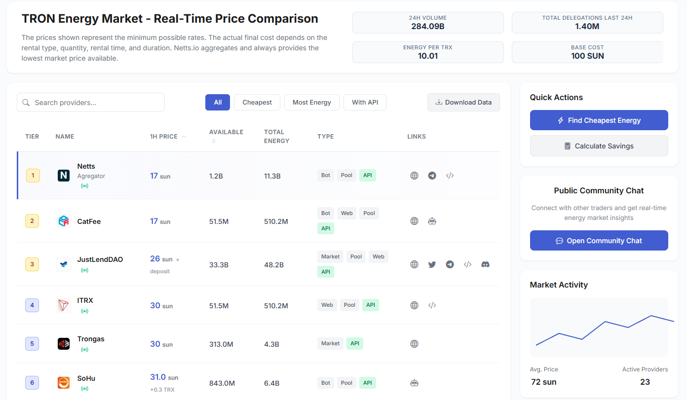 The TRON Energy market has become a dynamic marketplace with more than 20 providers battling it out to offer the lowest rates and best services. Renting Energy on TRON has become a common practice for both individual users and large-scale DApps, enabling them to optimize costs while maintaining flexibility. Unlike a single-vendor site, Netts.io aggregates offers and allows users to view prices alongside dynamically-updating market data to determine the best time to buy any offer.