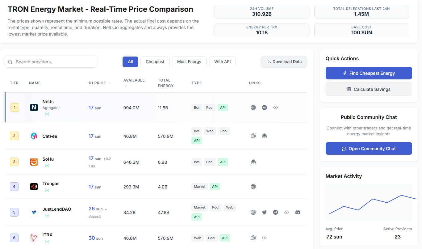 The Netts TRON Energy Market is a best-in-class solution for users that want to rent Energy on TRON. Netts aggregates the offers of more than 20 well-known partners such as CatFee, SoHu, Trongas, JustLendDAO, etc., ensuring that the lowest price on the market is constantly offered. Whether you are an occasional user or an organization requiring Energy in larger quantities, real-time price comparison ensures that you find the best rates for your needs.