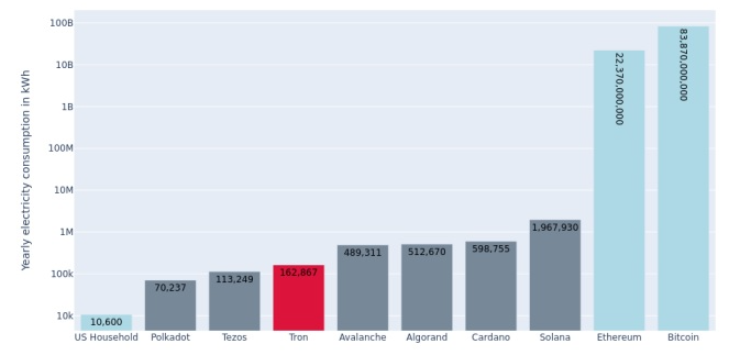 TRON, for example, employs a delegated proof-of-stake (DPoS) consensus mechanism. Instead of using the thousands of miners to compete with one another to validate transactions, TRON lets a small number of elected validators maintain the network. This method allows keeping the network functional with a fraction of the computational power needed. TRON's "Annual Electricity Consumption Over Time" as of recent data shows that the total amount of electricity consumed by TRON is comparable to only a handful of normal households, and its carbon emissions are a small fraction of those from PoW-based blockchains.