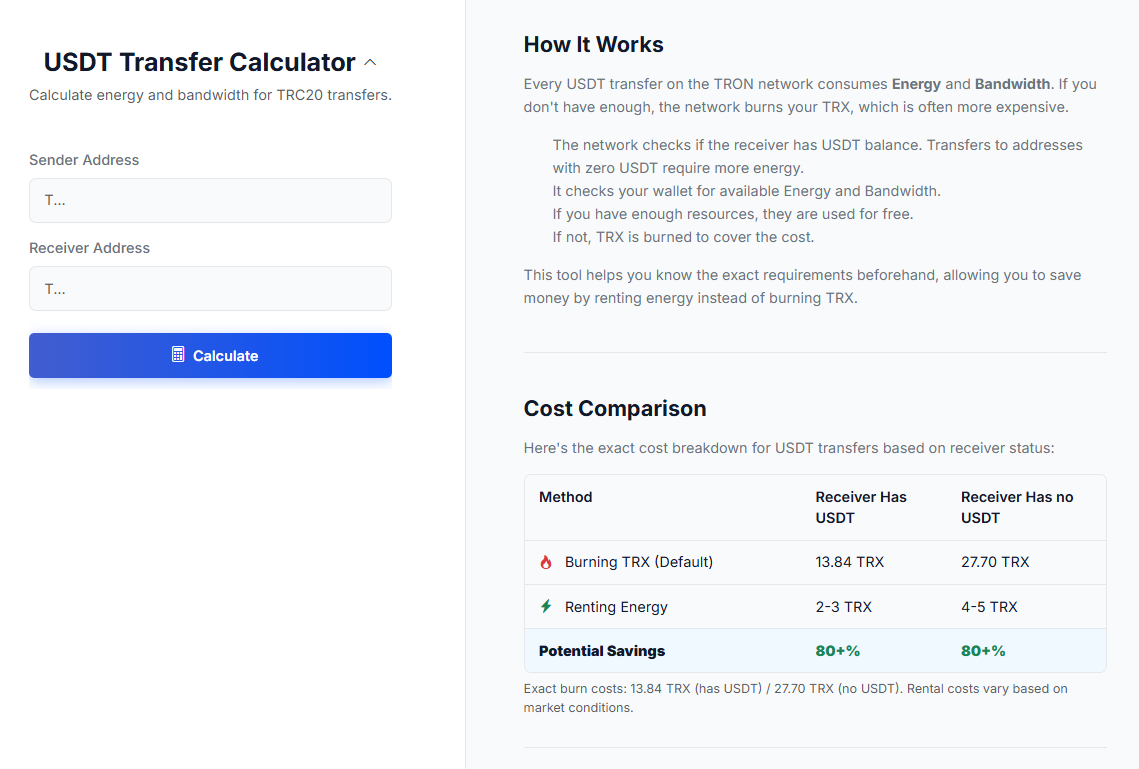 The calculator also offers a transparent cost breakdown, displaying the savings possible by renting Energy rather than burning TRX. This can cut transaction costs by more than 80% for users in many cases. The API is hugely beneficial for developers and businesses since it gives programmatic access to energy calculation data and can easily be integrated with existing workflows. With the USDT Transfer Calculator, users save money while ensuring the effective and optimal use of the TRON network's resources, solidifying its status as a green blockchain leader.