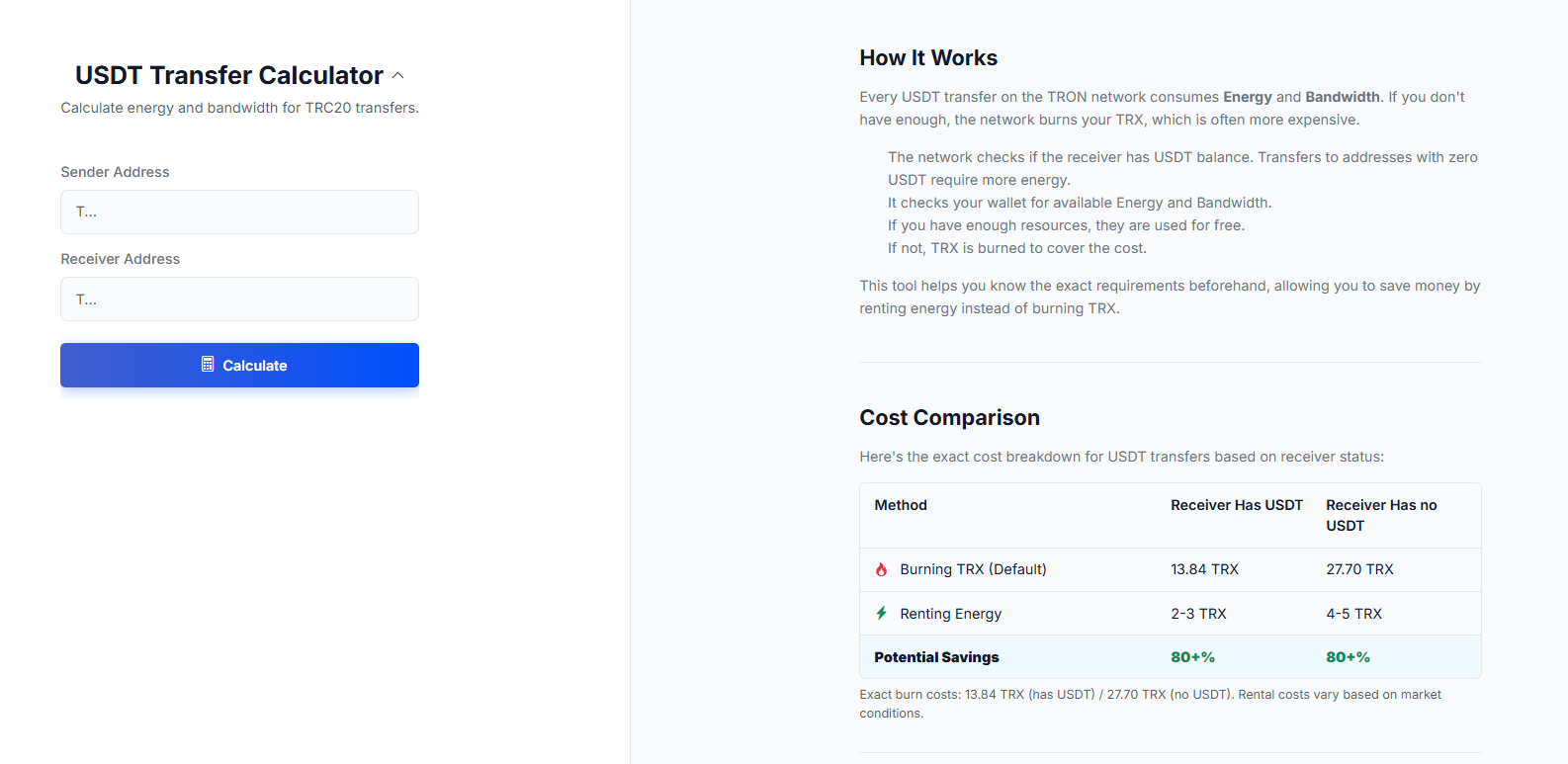 For frequent users, it is essential to operate securely and efficiently, this includes the management of transaction costs when using the TRON network. That's why tools like Netts include a USDT Transfer Calculator to enable users to calculate the exact Energy and Bandwidth required for their specific transfers. By ensuring the receiver’s balance status (which will cost them more if sending an empty wallet) and by measuring the exactly required resources, traders can prevent unexpected TRX Burns and make their transfers secure as well as inexpensive.