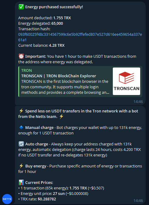 On the topic of efficiency and making your experience as a crypto user more efficient, particularly when wasting native assets paying for people to relax on networks, tools that cut costs should be recognised. Managing transaction costs is a recurrent fear for all who operate on the TRON network. Enter services such as the Netts Energy Charge Bot for reduced TRON USDT transfer fees. In case you have no choice however to have your TRON USDT transfer fees charged at the nominal fee, you can also use TRON Energy bot, which recharges Energy.