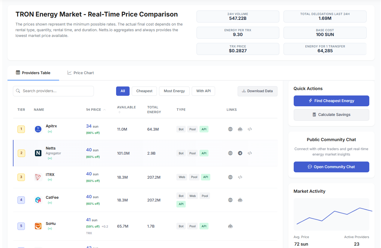 To be able to successfully navigate the landscape, aggregating and ameliorating tools are necessary. Enter services like Netts, which aims to tackle just this problem by offering a TRON Energy Market that brings together all of the providers and promises users the lowest possible rate — currently 37 sun. With a real-time comparison of 20+ energy providers and additional features such as bulk rental and API integration, traders and developers can cut down on transaction costs by as much as 90%, meaning that the friction of fees does not get in their way to the top.
