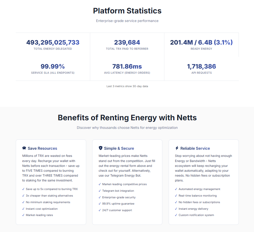 For those seeking to engage with this latest evolution and streamline their operations on the leading edge of new blockchain networks, finding that middle ground between digital assets has never been more important. Netts.io provides a one-click solution to rent energy if you want to transfer USDT on Tron. It is an enterprise grade service that intelligently routes optimally priced energy from billions of energy units from both verified and unverified providers, making it a premier energy aggregator.