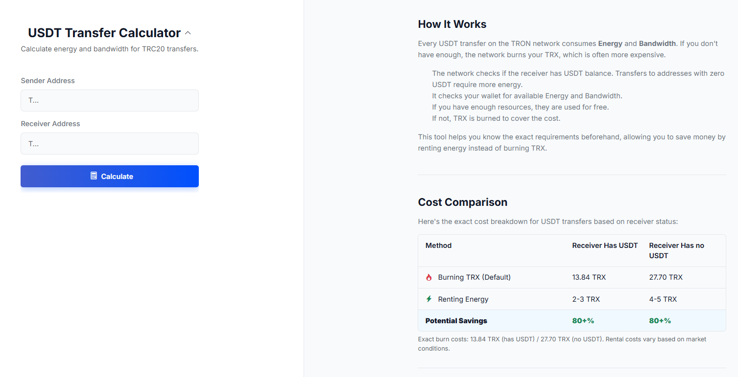 Because sending to addresses that have zero USDT already requires even more energy from the network, the tool can verify whether the receiving party has a USDT balance before it prompts the transfer. It also scans the wallet for resources and breaks down the cost for the user: